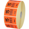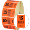 Röda klisteretiketter på rulle med svarta bokstäver med text: "15:- chark".