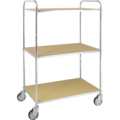 Høy plattformvogn med 3 hyller og solide hjul som gjør den enkel og smidig å kjøre. Elektrogalvanisert med ESD-hyller. Matter på vognene tåler opptil 400 °C varme.