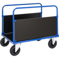 Gavelvagn med två gavlar i laminat på långsidorna med handtag av pulverlackat stål. Gavelvagn serie 300 obromsad från Kongamek har en solid plattform i laminat och lämpar sig utmärkt för lagermiljöer.