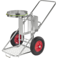 Städkärra för utomhusbruk med gummistropp som håller säcken på plats, hållare för skyffel och borste, samt ett fack för diverse prylar.