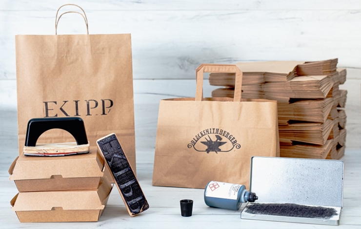 Stempelkit til papirartikler, fx papirposer. Dette kit indeholder et stempel med dit ønskede tryk samt tilhørende stempelpude og sort farve (250 g).