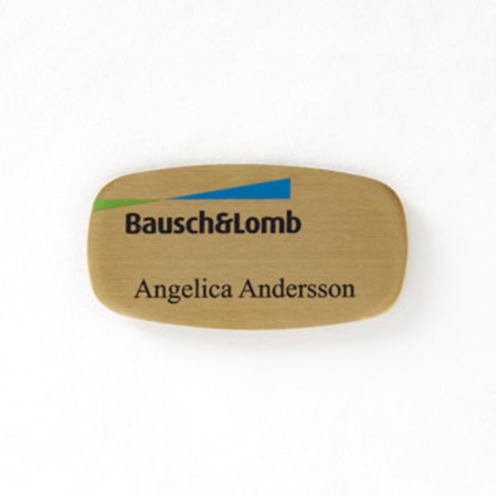 Navneskiltene i TV-Bricka formatet er designet i metal og plexiglas med farverne sølv, messing og hvidfrostet. Trykkes med 1-4 trykfarver. Leveres som standard med nål og kan suppleres med magnet eller klemme.