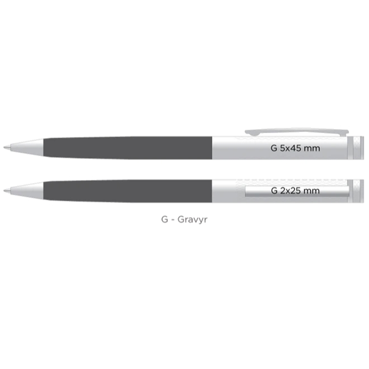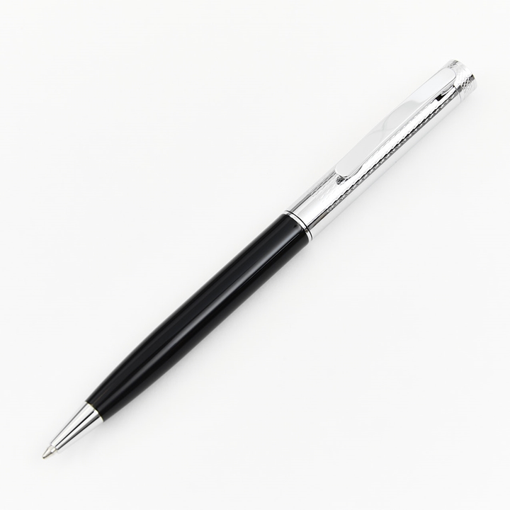 Gavepennen Hilton med en sofistikeret design giver et stærkt indtryk. Med sin sortlakerede pennekrop og smidige drejemekanisme er den et tidløst profilprodukt. Den blankkromede øverste del er prydet med et dekorativt mønster, der forhøjer elegance. Kan graveres på det udvalgte område på toppen eller på klippet.