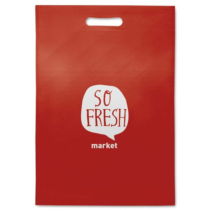 Flad, vertikal shoppingpose i non-woven med udstanset håndtag. Vælg ønsket materiale, trykplacering og farve.