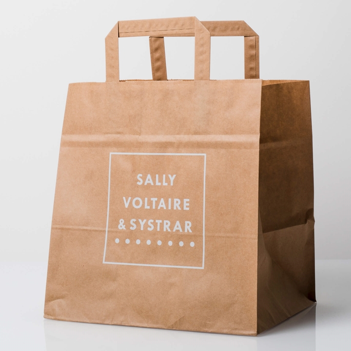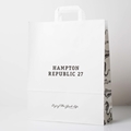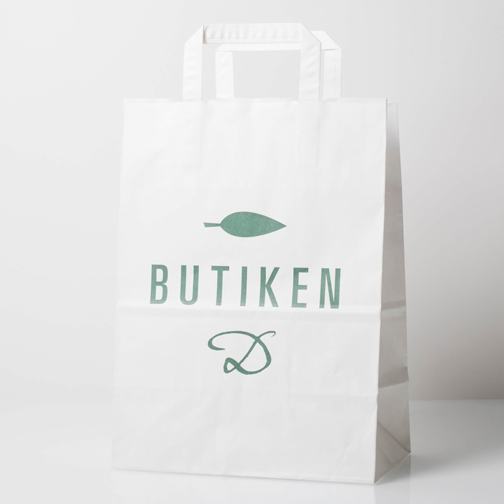 Vita och bruna/natur tvinnade pappershandtag som standard. Standardfärger och klädda hårda bomullshandtag som tillval.