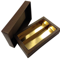 En fin brun pralinæske, som er fremstillet af papir, der minder om læder. Pralinæsken giver en luksuriøs indpakning til praliner og konfektureprodukter.