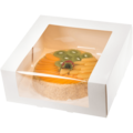 Hvid kageæske med vindue, der er perfekt til kager, bagværk, sandwiches, småkager og fastelavnsboller.