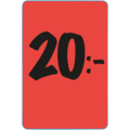 Røde klistermærker på rulle med sorte bogstaver med teksten: "20:-".