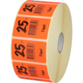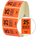 Røde klistermærker på rulle med sorte bogstaver med teksten: "25:- fugl".