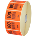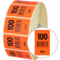 Røde klistermærker på rulle med sorte bogstaver med teksten: "100:- kød".