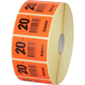 Røde klistermærker på rulle med sorte bogstaver med teksten: "20:- kolonial".
