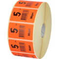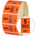 Røde klistermærker på rulle med sorte bogstaver med teksten "5:- mejeri".