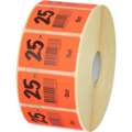 Røde klistermærker på rulle med sorte bogstaver med teksten "25:-"