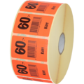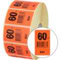 Røde klistermærker på rulle med sorte bogstaver med teksten "60:- kød".