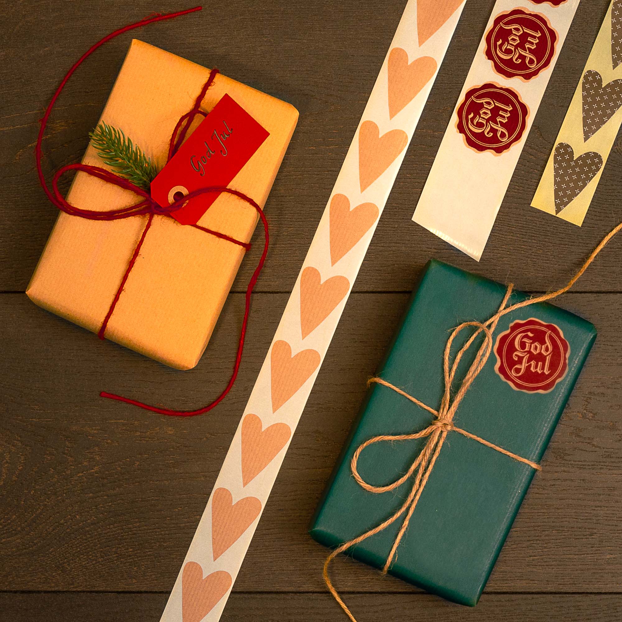 Forvandl en neutral gave med farverige bånd, mærkater der giver en rustik følelse, håndplukket gran, naturfarvet jutesnor, der binder pakken sammen, og elegante sløjfer i guld, sølv, rød eller blå. Lad din kreativitet styre og skab personlige pakker, der imponerer modtageren!