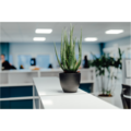Aloe konstväxt med gröna blad i svart kruka, står vackert och dekorativt i fönster, kontor, reception och hotellrum för en mjuk atmosfär.