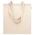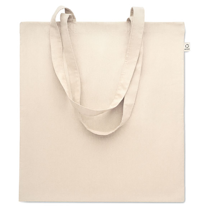Tote bag made from recycled material (70% recycled cotton and 30% RPET). Perfect for companies looking to combine clear branding with environmental awareness. With its long handles and dimensions of 38x42 cm, it’s easy to carry and offers ample space for printing. A simple and clean beige design makes it easy to match with various logos.