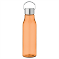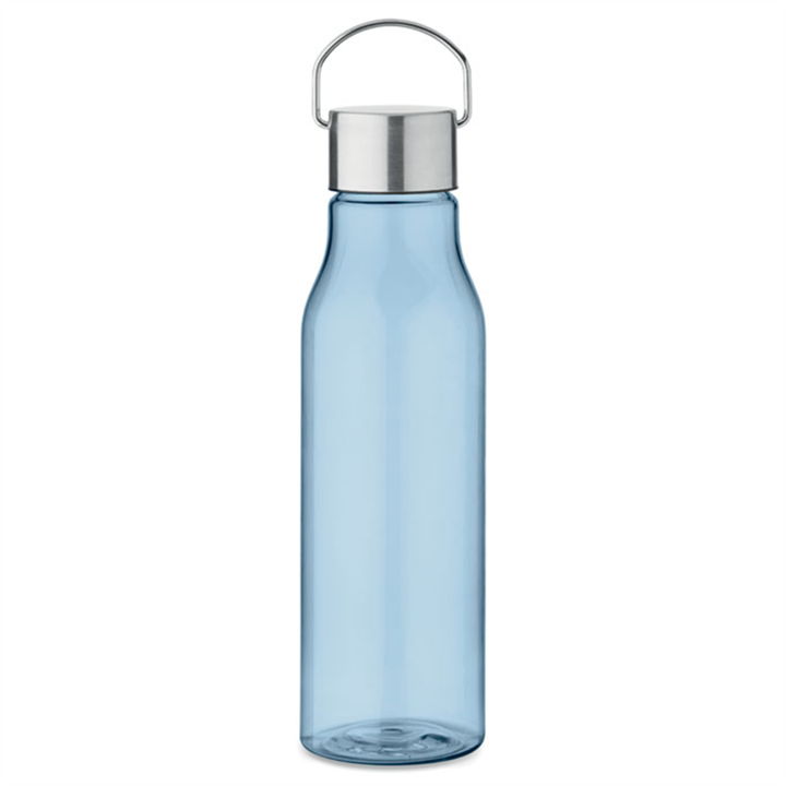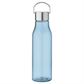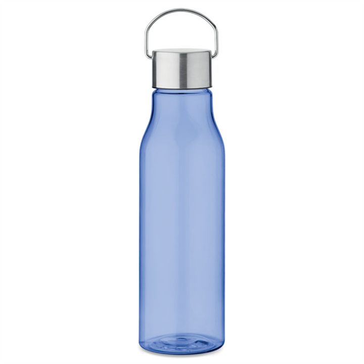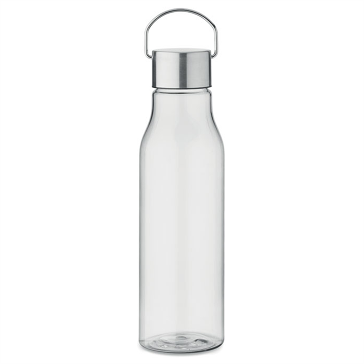 Transparent drinking bottle with a practical screw cap in stainless steel with handle. The bottle is made from recycled RPET and is BPA-free. The design is leak-proof and comes in 6 transparent colors that match the stylish metal lid.