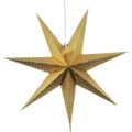 Gold-colored paper star with a lovely pattern. The star is 70 cm tall and has space for a candle. It is placed in a window where it emits a wonderful glow in the dark.