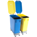 Sorteringsvagn Paket F - Avfallskärl 2x60Lfrån Hykab. Praktiska kärl i gult & blått med tillhörande lock med gångjärn. Båda kärlen innehåller ett svart 9L insatskärl. Kärlen är placerade på vagn med 50 mm hjul, para ihop eller använd enskilt.