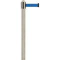 Avspärrningsstolpe med blått band från Securit. Stolpen är av polerat rostfritt stål med fyrvägsanslutning och infällbart nylonband. Använd den till att arrangera köer eller spärra av områden.