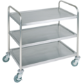 Rostfri serveringsvagn med 3 våningar från APS. Vagnen är tillverkad i rostfritt stål och tre brickor på 83x51cm, med ett mellanrum på 26cm. Den har en total lastkapacitet på 120 kg och 4 hjul med 2 bromsar.