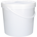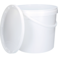 White neutral plastic buckets with tightly sealing lids. Approved for contact with food. Perfect for storing and pickling food items such as sauces, dressings, vegetables, fish, etc.