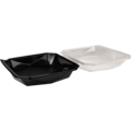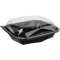 Duni Octaview is a black, 8-sided, salad-shaped container with hanging caps. Volume: 1150 ml, Dimensions: 225 x 225 x 80 mm.