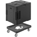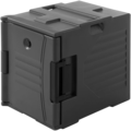 A hard plastic heat box that keeps both hot and cold. Featuring two sturdy carrying handles.