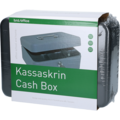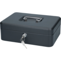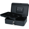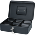 Cash box 703 Black. Cash box made of steel with rounded corners and a built-in handle. Cylinder lock with two keys and a 6-compartment tray inside. Size: 250 x 180 x 80 mm.