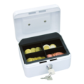 Cash box made of steel sheet with rounded corners and recessed handle. Cylinder lock with 2 keys, insert with 6 compartments