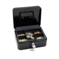 Cash box made of steel sheet with rounded corners and recessed handle. Cylinder lock with 2 keys, insert with 6 compartments