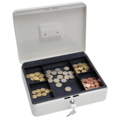 Cash box made of steel sheet with rounded corners and recessed handle. Cylinder lock with 2 keys, insert with 10 compartments.