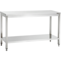 Workbench 600 from Bartscher. The bench is made of stainless steel, which makes it easy to maintain good hygiene. The workbench is equipped with two shelves that provide ample space. It is perfect for kitchen environments or similar settings.