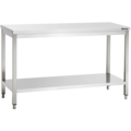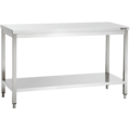 Workbench 700 from Bartscher. The bench is made of stainless steel, which makes it easy to maintain good hygiene. The workbench is equipped with two shelves that provide ample space. It is perfect for kitchen environments or similar settings.