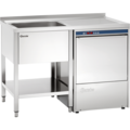 Stainless steel input bench 700 B1200 with a sink placed to the left of the dishwasher from Bartscher. There is also the option to place the dishwasher under the drip area.