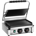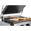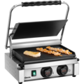 The Panini grill MDI 1G from Bartscher features grill plates with optimal heat conductivity made of cast iron. It comes with a robust construction and a simple rotary control with digital indication, timer, and signal tone.