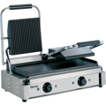 Contact grill 36002GR with dual grilling surfaces from Bartscher. The grill is made of stainless steel and enameled cast iron.