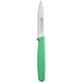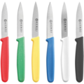Set of 6 paring knives from Hendi. The knives are made of stainless steel with 6 different colored polypropylene handles. The paring knives are perfect for use in professional kitchens where vegetables and fruits are peeled.