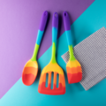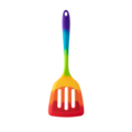 Perforated rainbow-colored silicone spatula from Taylors Eye Witness. The spatula features an inner steel part that provides stability and an outer part made of LFGB*-graded and certified silicone, free from BPA, lead, phthalates, mercury, PVC, and latex.