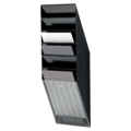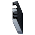 Black plastic brochure stand with 6 compartments for wall mounting.