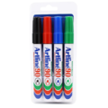 Permanent marker with a 2.0-5.0 mm chiseled tip. Quick-drying, water-resistant, aluminum body, refillable, alcohol-based permanent ink without xylene. 4-pack, includes black, red, blue, and green.