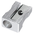 - Block-shaped metal pencil sharpener.