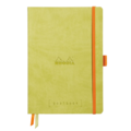 Rhodiarama GoalBook imitation leather with a glued spine and embossed Rhodia logo, 120 non-microperforated sheets, 90 g brushed ivory vellum Clairefontaine paper, 224 numbered sheets, 6-sided index, 2 perpetual calendars, 2 ribbon bookmarks, expanding inner pocket secured with elastic, flat opening at 180°. GoalBook A5 anise green A5 (14.8x21 cm) dotted grid.