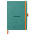 Rhodiarama GoalBook Italian leather imitation with a glued spine and embossed Rhodia logo, 120 non-microperforated sheets, 90 g brushed ivory vellum paper from Clairefontaine, 2 ribbon markers, expanding inner pocket secured with elastic, flat opening at 180°. GoalBook A5, peacock A5 (14.8x21 cm), dotted grid.