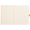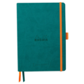 Rhodiarama GoalBook imitation leather with a glued spine and embossed Rhodia logo, 120 non-microperforated sheets, 90 g brushed ivory vellum Clairefontaine paper, 2 ribbon markers, expanding inner pocket secured with elastic, flat opening at 180°. GoalBook A5, peacock A5 (14.8x21 cm), dotted grid.