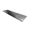 Rechargeable design keyboard for discerning customers. Quality meets design and innovation. The CHERRY KW 9100 SLIM is a silver-black version of the keyboard from the popular DW 9100 SLIM desktop set. As with the tried and tested desktop version, first-class workmanship, perfectly coordinated design, and innovative functions come together. Proven and versatile at the same time. The flat keyboard with AES-128 encryption has a solid metal plate and is as robust as CHERRY customers are used to, despite its thin design. Thanks to the SX scissor mechanism, you type quietly and benefit from a precise pressure point similar to a laptop keyboard. Particularly frequently used functions can easily be utilized using the selected additional keys. Thus, the minimalistic beauty remains simple and user-friendly. Versatility is nevertheless not neglected: With the KW 9100 SLIM, you can easily switch back and forth between RF or Bluetooth® transmission. The magnetic support bar can be attached and