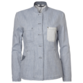 Stand-up collar with a striped detail on the inside of the neck. Chest pockets, one with a decorative button. Side pockets, the right one with a coin pocket in striped fabric. Transparent buttons. Loop at the back of the neck.