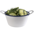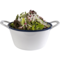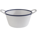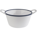 Skål med handtag i vit färg med blå kant ur serien Enamel Look från APS. Skålen är tillverkad av melamin och passar att användas på restauranger och kafér där det serveras härliga måltider