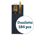 • Duniletto D-lin is a solution that provides you with a napkin and cutlery pocket in one. It is a folded solution that saves time. The exclusive napkin feels and looks like linen, and the raw material comes from responsible and certified forestry.